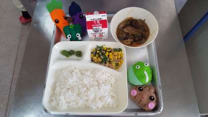 今日の献立は、マーボなす・おくらのあまずあえ・つなとちんげんさいの炒め物・ごはん・牛乳です。
