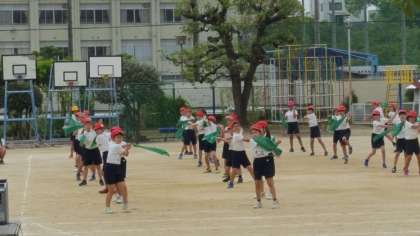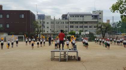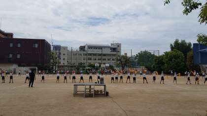 3・4年生の運動会の団体演技の練習の様子です。今日は、本番で使うバンダナを持っての練習です。