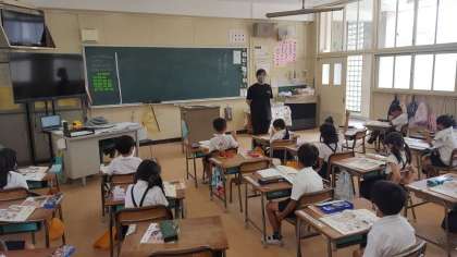 2年生は、図画工作の授業でした。クレパスと絵の具を使って、魚の絵描いていました。