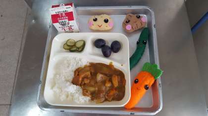 今日のメニューは、チキンカレーライス[米粉]・きゅうりのピクルス・ぶどう(巨峰)・ごはん・牛乳です。