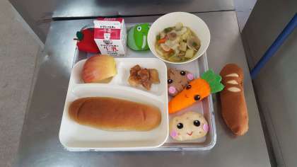 今日のメニューは、鶏肉のガーリック焼き・豚肉と野菜のスープ煮・りんご・黒糖パン・牛乳です。