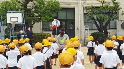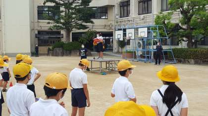 本日、全校朝会を行いました。校長先生のお話の後で看護当番から先週の反省と今週の目標の連絡がありました。