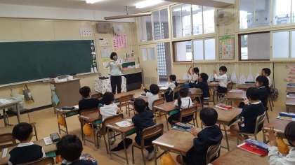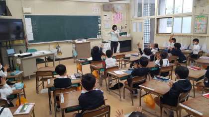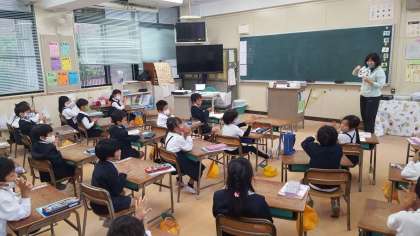 1年生は、算数の授業でした。計算カードを使ってこたえをハンドサインで答えていました。先生がカードを提示すると、すぐに反応します。さすがです。