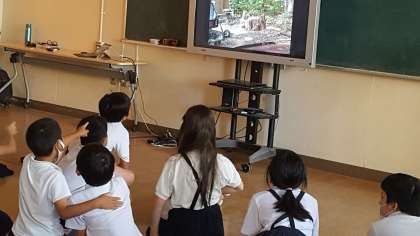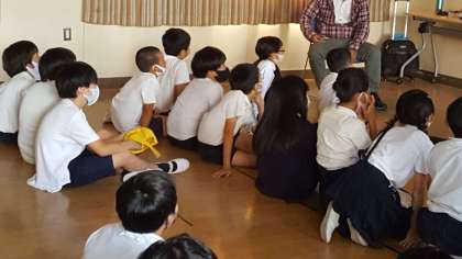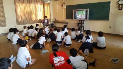 5年生の英語の授業の様子です。今日は、クイズ形式の授業で、画面に隠された答えを探しています。みんな画面に集中しています。
