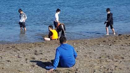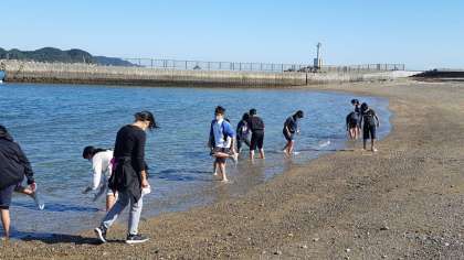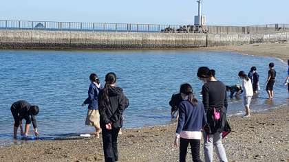 浜辺で遊んでいます。早くもびしょぬれの子がいます。