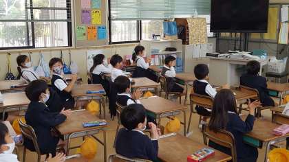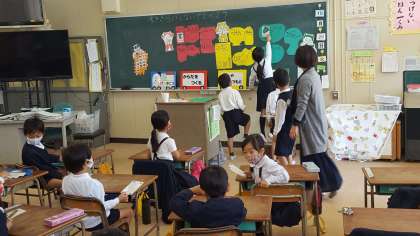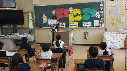 1年生は栄養教諭から、食育の授業を受けました。「すききらいなしでたべよう」について学んでいました。食品カードを掲示したりして楽しく学べました。