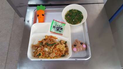 今日の献立は、ピリ辛丼・中華スープ・ソフト黒豆・牛乳です。