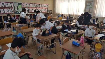 5年生は、国語の授業で調べ学習をしていました。タブレット端末やパソコンを使って調べていましたした。
