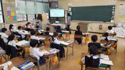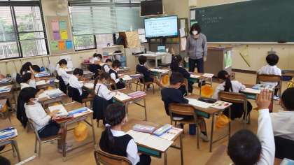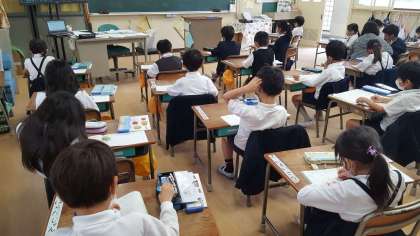 1年生は、算数の授業でした。ひき算の学習をしていました。大きな声で問題を読んで、ノートに式を書いていました。