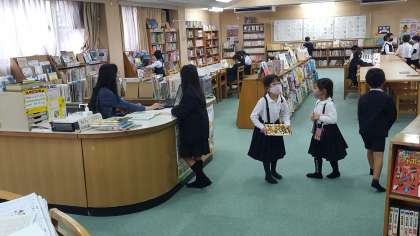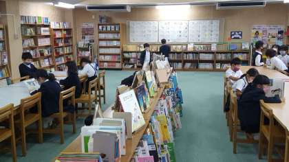1年生は、図書の時間でした。図書館で読みたい本を借りていました。椅子に座って読む姿も素敵でした。