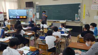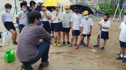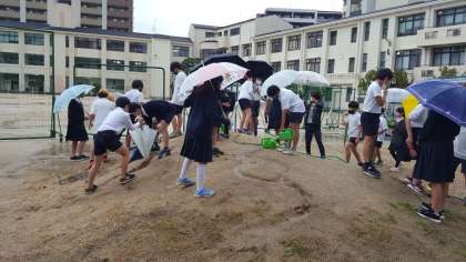 5年生は、理科の授業でした。「流れる水のはたらき」を学習していました。教室での説明の後、築山で実験をしていました。雨の中でしたが、楽しそうでした。