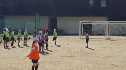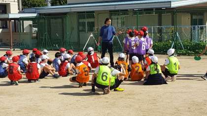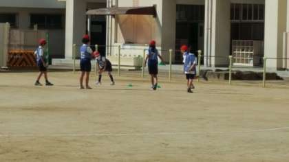 4年生は、体育の授業でした。リレーのバトン渡しをしていました。どこでスタートするかを確認しながらグループで練習していました。