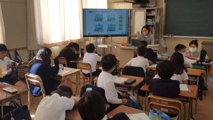 4年生は、教室で外国語活動の授業でした。誰の筆箱かを当てるクイズ形式の学習でした。英語での説明を聞いて、誰のものなのかを判断していました。