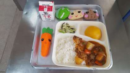 今日の献立は、ハヤシライス【米粉】・キャベツのひじきドレッシング・黄桃(缶)・牛乳です。