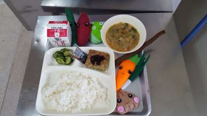 今日の献立は、お好み焼き・豚汁・きゅうりの梅風味・ごはん・牛乳です。今日も静かにしっかり食べましょう。