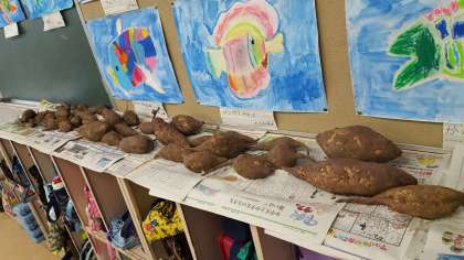 2年生は、国語の授業でした。先生の範読に合わせて、みんなで一緒に朗読をしていました。後、この前収穫したさつまいもです。とても立派ですね。
