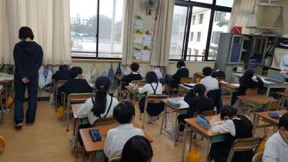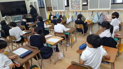 3年生は、漢字テストの真っ最中でした。左右に別方向を向いてテストを受けていました。