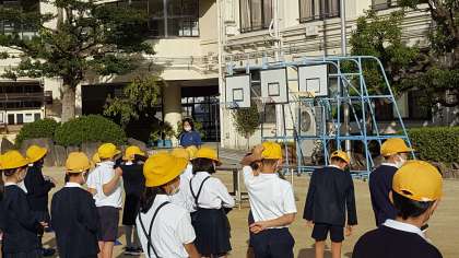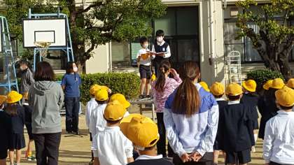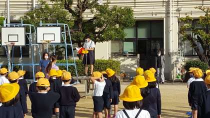 本日、全校朝会を行いました。校長先生の話の後に、看護当番の児童から先週の反省と今週の目標についての話がありました。