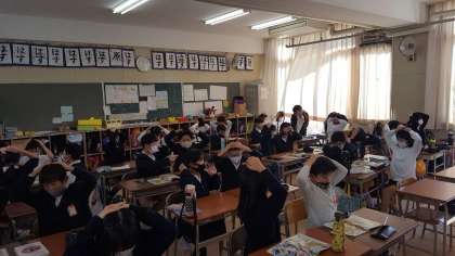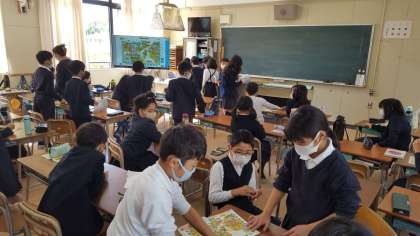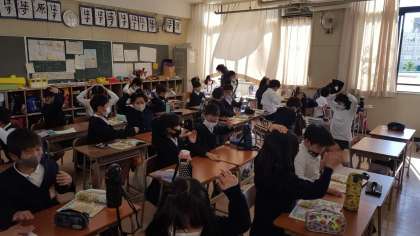 4年生は、外国語活動の授業でした。アルファベットを使ったゲームをしていました。アルファベットを発音しながら、特定の文字が出たら消しゴムを取り合うというゲームです。すごく楽しく授業を受けていました。