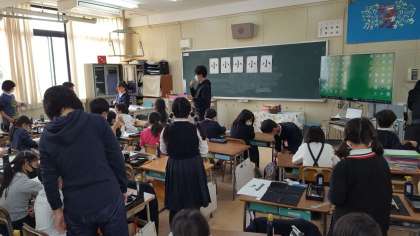3年生は、国語の授業でした。毛筆の学習でした。「小」の字を書いていました。炭がついてもよい服を着ての授業です。上手に書けましたか?