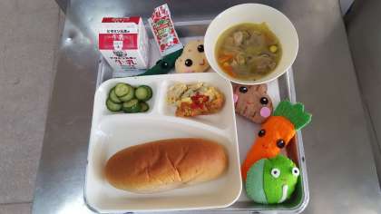 今日のメニューは、ツナポテトオムレツ・スープ・きゅうりのバジル風味サラダ・黒糖パン・牛乳です。