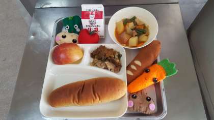 今日のメニューは、豚肉のカレー風味焼き・ケチャップ煮・りんご・黒糖パン・牛乳です。