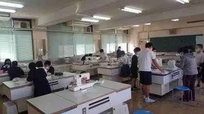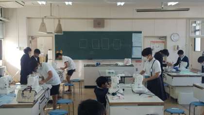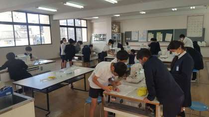 6年生は、家庭科の授業でした。ミシン縫いの学習をしていました。みんなで協力してミシンの準備をして、雑巾を作っていました。