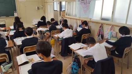 4年生は、道徳の授業でした。「雨ととの様」を題材にしてルールについて学習していました。みんな自分の考えをノートに書いていました。