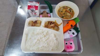 今日の献立は、鶏肉の甘辛焼き・みそ汁・大根の煮物・ごはん・牛乳です。