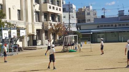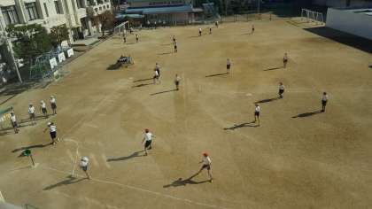 6年生は、体育の授業でした。グループに分かれてキャッチボールを入念に行ってから、Tボールの試合をしていました。今日も穏やかな小春日和で、運動するには絶好の天気でした。
