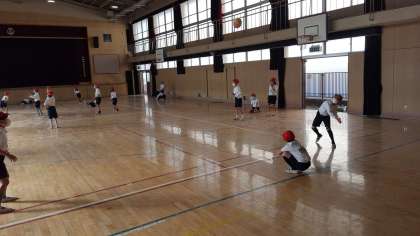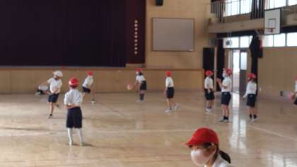 2年生は、体育の授業でした。講堂でボール使って運動をしていました。みんな楽しそうに投げたり受けたりしていました。