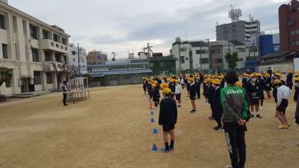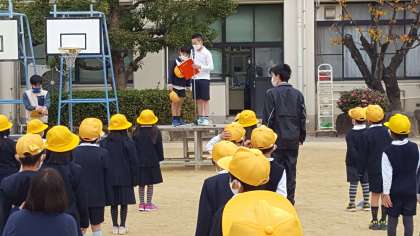 曇り空の中、全校朝会を行いました。校長先生から交通事故に気をつけようとの話がありました。続いて、看護当番から先週の反省と今週の目標についての話がありました。