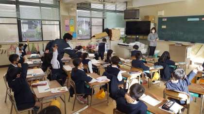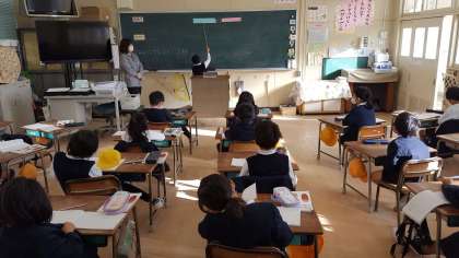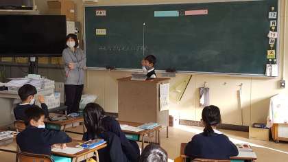 1年生は、算数の授業でした。足し算の問題作りについて考えていました。前に出て自分の考えを積極的に発表していました。
