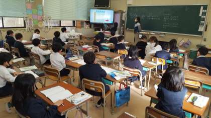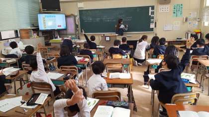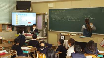 2年生は、算数の授業でした。かけ算の決まりについて考えていました。子ども達は自分の考えを、電子黒板を使って説明していました。