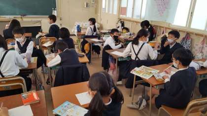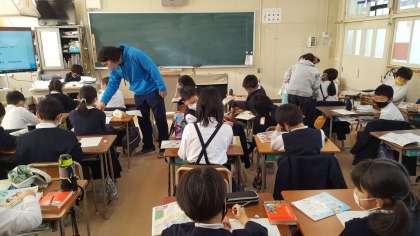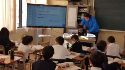 4年生は、外国語活動の授業でした。教室で、アルファベットを組み合わせてできる単語を見つけるクイズでした。みんなそれぞれにクイズも考えていました。楽しい活動でした。