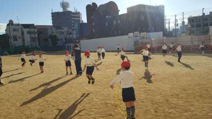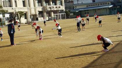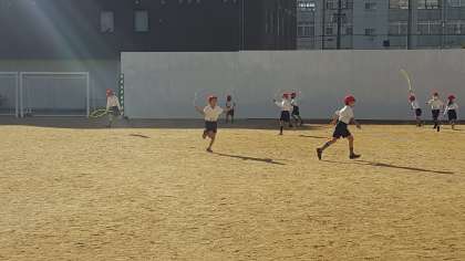 1年生は、体育の授業でした。寒い中、運動場で縄跳び運動をしていました。入念に準備体操をして、色々な跳び方にチャレンジしていました。最後は、かけあし跳びで運動場を走っていました。