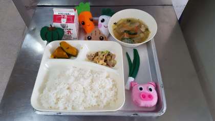 今日の献立は、豚肉と干しずいきのみそ煮・すまし汁・焼きかぼちゃの甘みつかけ・ごはん・牛乳です。