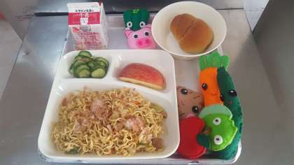 今日の献立は、和風焼きそば・きゅうりの甘酢あえ・りんご・黒糖パン・牛乳です。