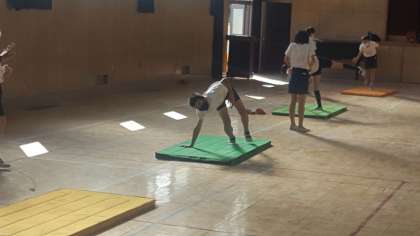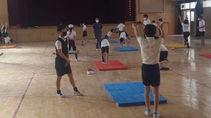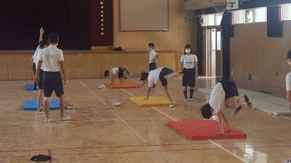 6年生は、体育の授業でした。講堂でマット運動をしていました。写真はロンダートという技をしているところです。みんなとても上手です。