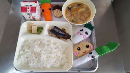 今日の献立は、いわしの生姜煮・みそ汁・高野豆腐の煮物・ごはん・牛乳です。