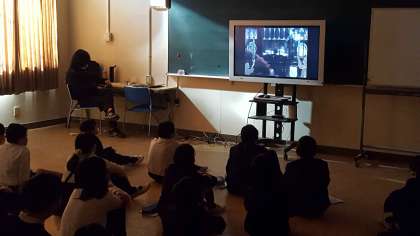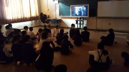 4年生は、外国語活動の授業でした。子ども達は、映像を見て楽しんでいました。面白い場面では手をたたいて喜んでいました。耳からの情報より目から入る情報で楽しんでいるようでした。