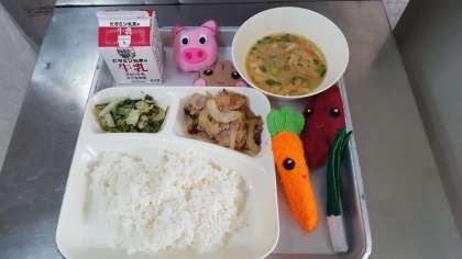 今日の献立は、豚肉の生姜焼き・さつまいものみそ汁・菊菜と白菜のごま和え・ごはん・牛乳です。