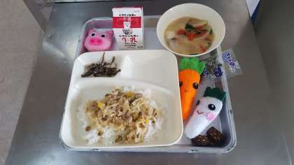 今日の献立は、れんこんのちらし寿司・雑煮・ごまめ・牛乳です。