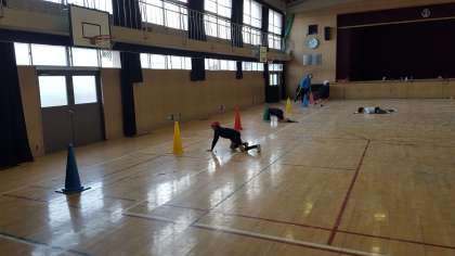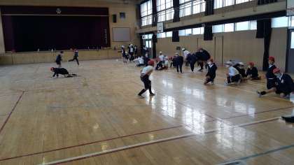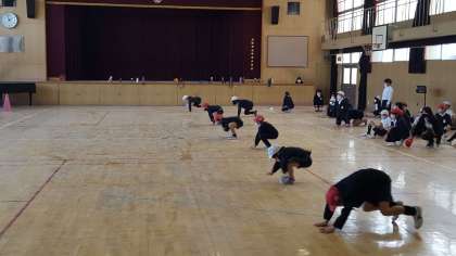 4年生は、講堂で体育の授業でした。4足歩行やかえる跳びなどいろいろな体勢でのリレーをしていました。明日は筋肉痛がでるかな?