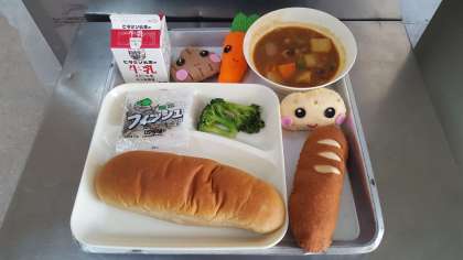 今日のメニューは、ビーフシチュー・ブロッコリーのサラダ・ミニフィッシュ・黒糖パン・牛乳です。