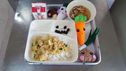 今日の献立は、親子丼・すまし汁・黒豆の煮物・牛乳です。