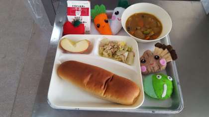 今日のメニューは、ミートボールと野菜のカレー煮・ツナとキャベツのソテー・りんご・黒糖パン・牛乳です。