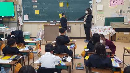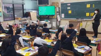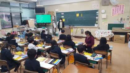 1年生は、算数の授業でした。3けたの数字について学んでいました。図を使って数字を表していました。みんな進んで手を挙げて、積極的に発表していました。