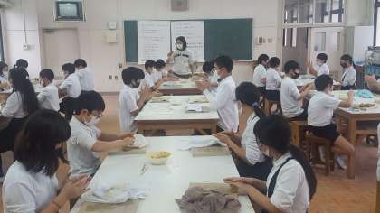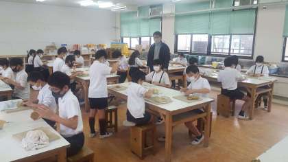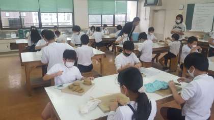 6年生は、図画工作の授業でした。図工室で、陶芸作品を作っていました。陶芸展用のシーサーの制作です。粘土のエア抜きをする音が図工室に響いていました。