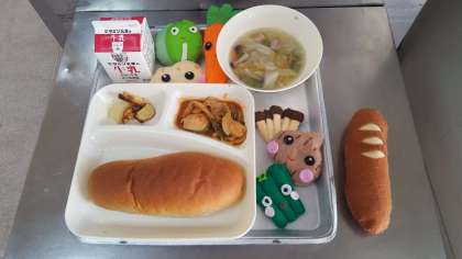 今日のメニューは、鶏肉のバーベキューソテー・焼きじゃが・ウインナーとキャベツのスープ・黒糖パン・牛乳です。